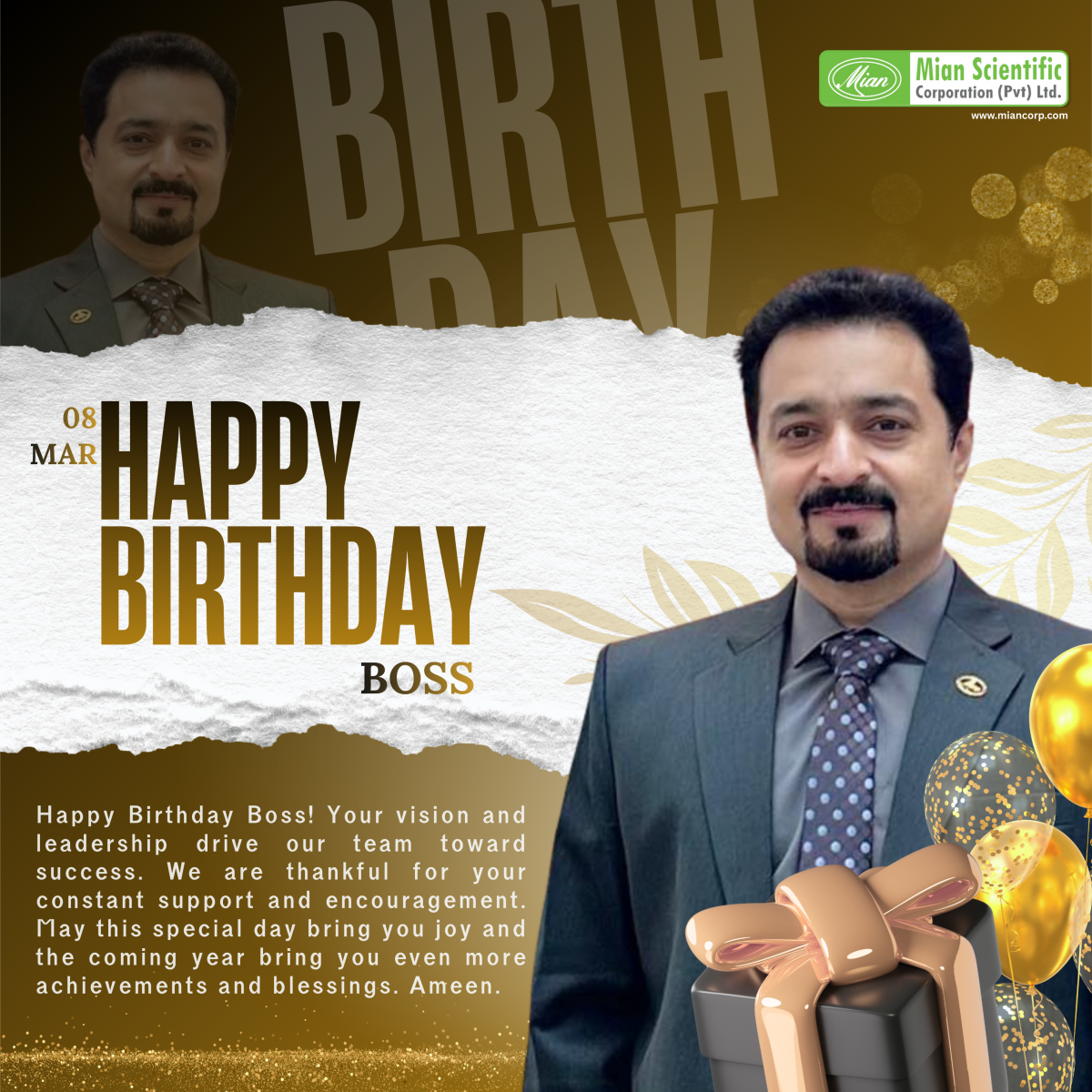 Happy Birthday Boss! Your vision and leadership drive our team toward success. We are thankful for your constant support and encouragement. May this special day bring you joy and the coming year bring you even more achievements and blessings. Ameen.